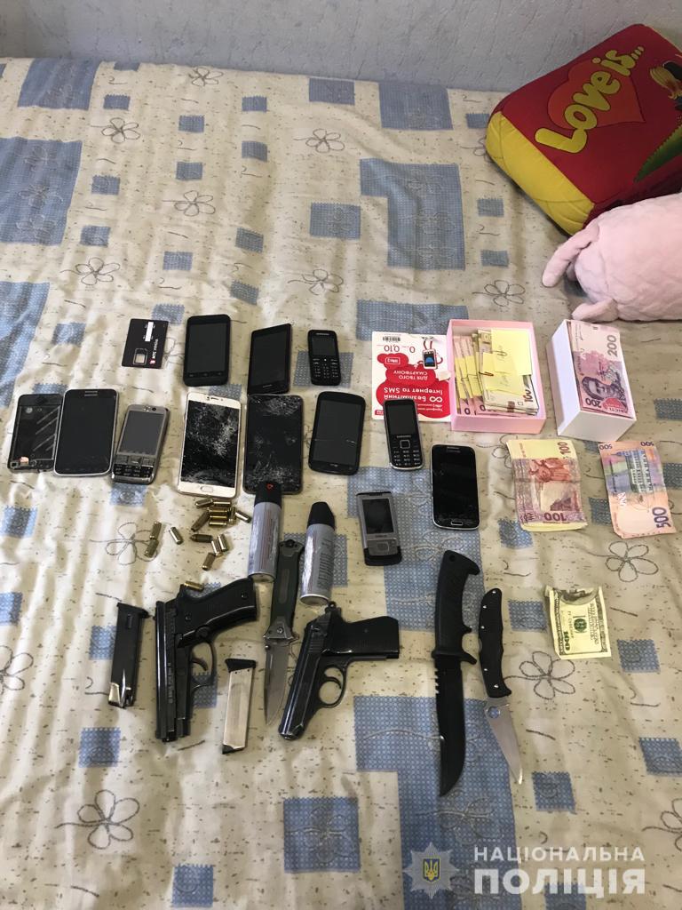 Правоохоронці провели 9 обшуків у помешканнях зловмисників. Вилучили зброю, мобільні телефони, банківські картки та кошти.