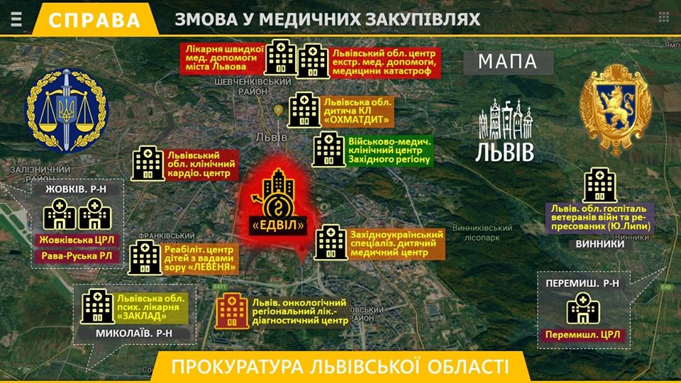 Прокурорка Львівщини Ірина Діденко на своїй сторінці у Фейсбуці повідомила, що до цієї корупційної схеми причетні понад 10 львівський лікарень. Окрім Західноукраїнського спеціалізованого дитячого медичного центру, це Військо-медичний центр західного регіону, Львівська обласна клінічна лікарня “Охматдит”, “Львівський обласний центр екстреної медичної допомоги та медичних катастроф, Лікарня швидкої медичної допомоги, Львівський обласний клінічний кардіоцентр, а також онкологічний регіональний лікувально-діагностичний центр. А також Жовківська, Перемишлянська та Рава-Руська райлікарні.