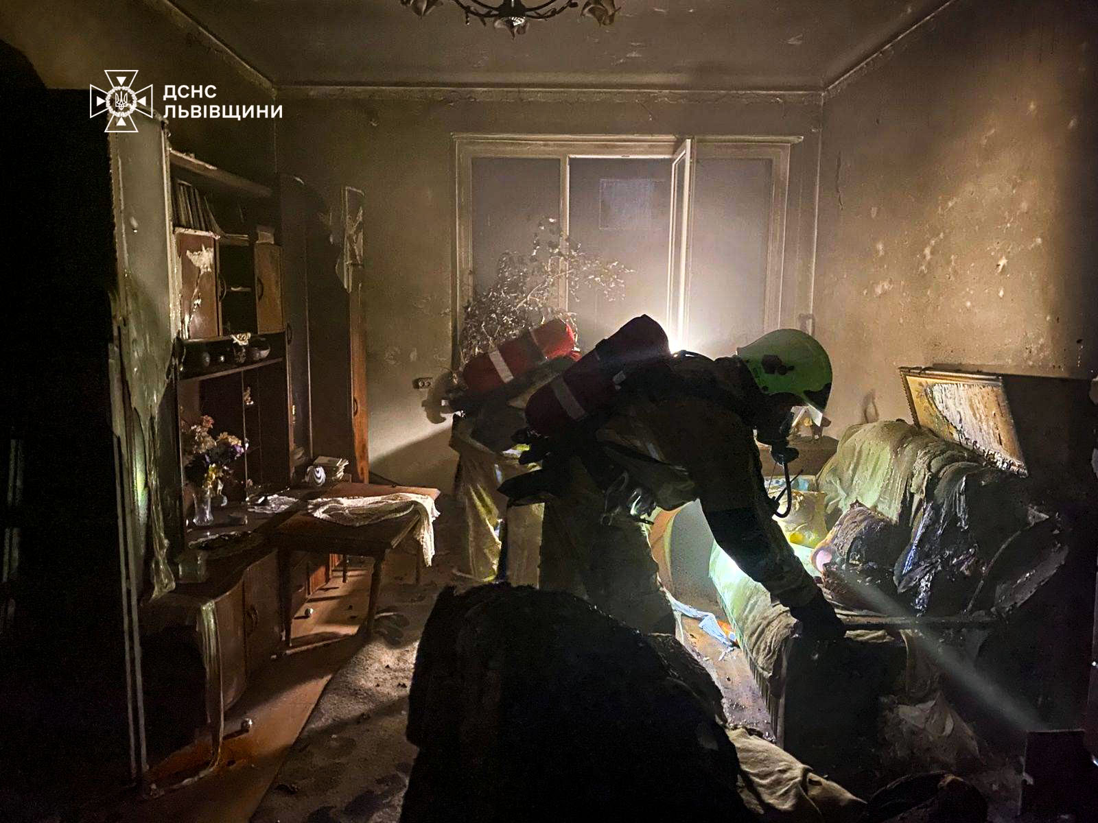 Пожежа виникла у вітальні — горів диван, розташований надто близько до сильно нагрітого п’єца. Висока температура спричинила сплавлення натяжної стелі, а квартира наповнилася токсичними продуктами горіння.