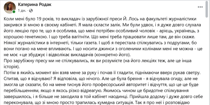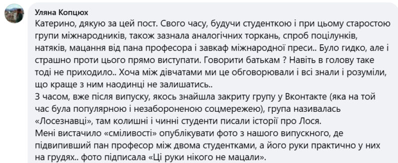 Я написав їй у коментарі, що прошу вибачення за те, що, працюючи свого часу на факультеті журналістики, не зробив того, що міг і мусив для того, щоб принаймні перевірити ті чутки, які й десять років тому долинали до моїх (і не тільки!), вух, чи тим паче докласти зусиль, щоб припинити це паскудство.