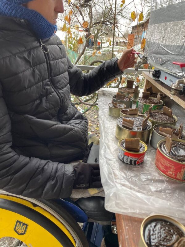 “Я ходжу на риболовлю, люблю це з дитинства, тому вдома було багато банок з-під кукурудзи. Я їх не викидав, а приносив додому, щоб не засмічувати берег. Влітку 2022 року випадково побачив статтю в інтернеті, що потрібні окопні свічки і спробував їх робити з тих баночок, що я приносив додому. Мені принесли воду, щоб я відчистив банки. Сам цього зробити не можу, бо в мене пальці і руки не працюють, так як в здорової людини, через травму шийного відділу хребта. Пальці зовсім не працюють, а руки на 20%. Тому це було викликом для мене, але я хотів зробити якусь користь для хлопців”, – розповідає волонтер.