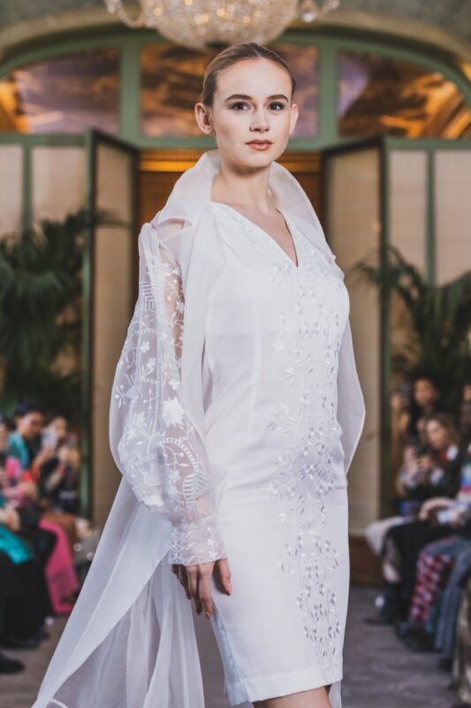 На показі дизайнерка представила свій бренд Галинка Шуневич і нову колекцію «It’s my soul». Одним із образів у цій колекції був комплект сукні та пальто з українським орнаментом, який майстриня взяла з українського рушника.