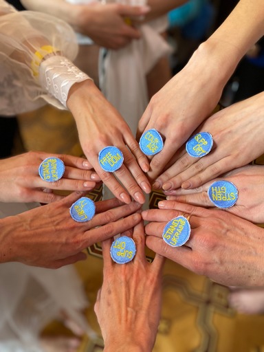 Щоб привернути увагу до України, дизайнерка виготовила синьо-жовті персні, на яких писали гасла: «Stand with Ukraine\Fredoom\Liberty\ Strength\ Slava Ukraini». Їх вона роздала моделям.