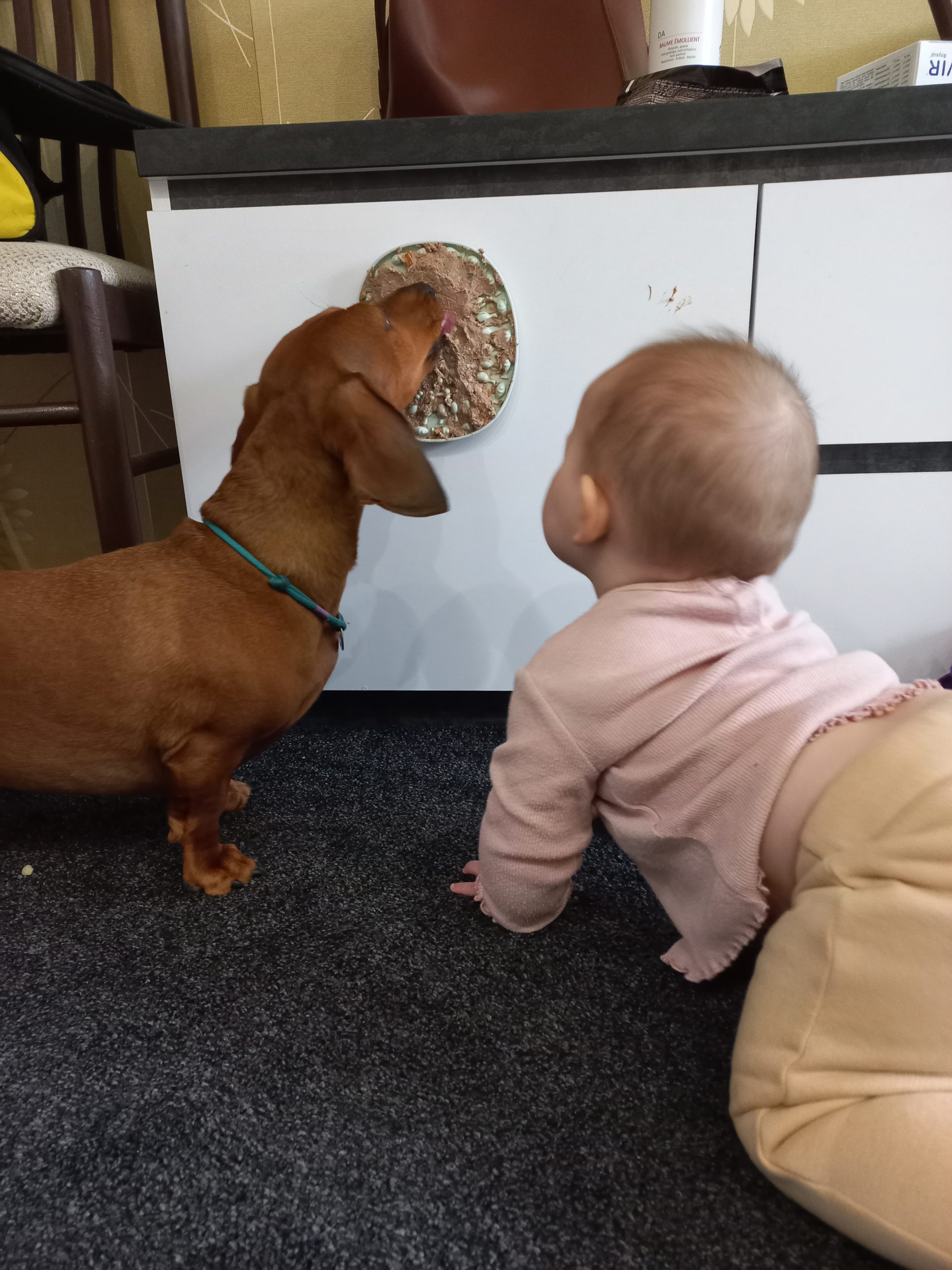 Потім у нашій історії з’явилася донечка. Дафна перейшла в режим няньки: охороняла сон, підчищала підлогу під дитячим стільчиком, ловила кожен впалий шматочок м’яса з серйозністю санітарної інспекції.