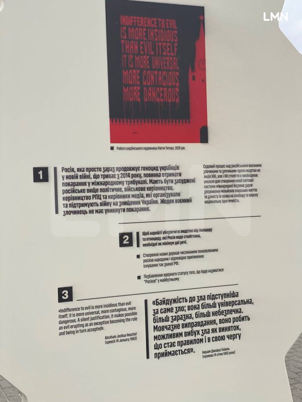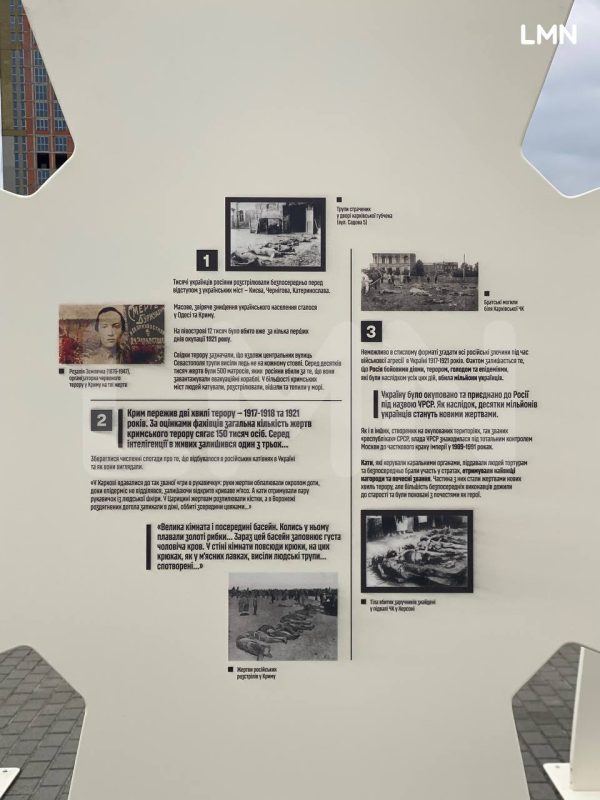 Страшна історія, яка завжди поруч. Вона не кричить, але від неї важко піти. Саме такі емоції викликає інтерактивна вулична експозиція “Війна на знищення”, харків’янина Леоніда Брагіна, яка через поєднання історичних фактів і візуальних образів розповідає про багатовікову політику росії щодо України.