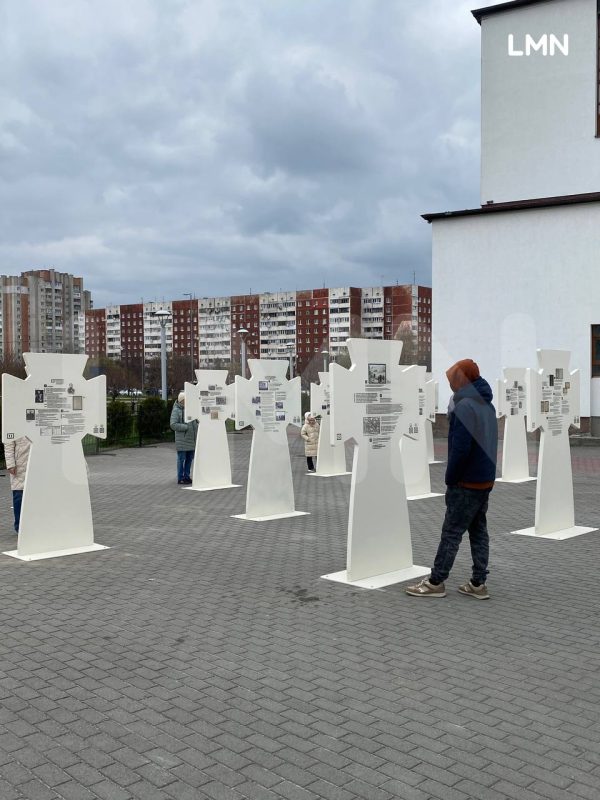 На подвір’ї Церкви Різдва Пресвятої Богородиці УГКЦ на Сихові між звичним міським шумом з’являється тиша. Не повна, але інша. Та, в якій починаєш читати повільніше і дихати стає значно складніше ніж зазвичай. Люди просто стають у чергу, щоб помилитися до плащаниці і помічають дивні білі колони, тож підходять і з цікавістю розглядають. Я роблю те саме.