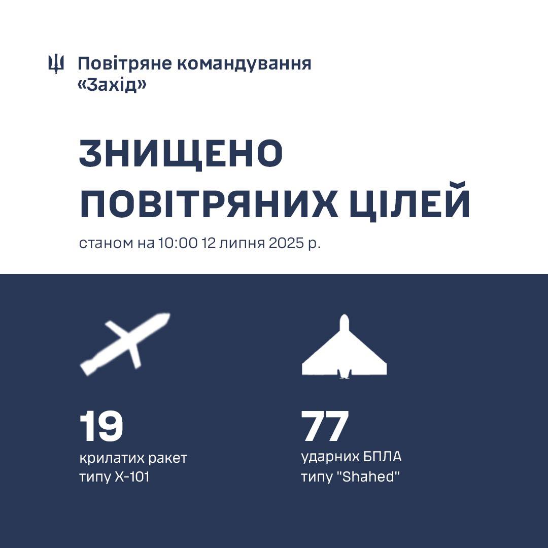 В ніч на 12 липня ПвК “Захід” знищили 19 крилатих ракет та 77 ударних безпілотників. Про це повідомили у командуванні.