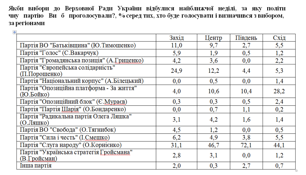 Характерно, що у всіх макрорегіонах “Слуга народу” є лідером електоральних симпатій. У західних і центральних областях друге місце посідає “Європейська солідарність”, а третє – ВО “Батьківщина”. На сході й півдні другий показник має “Опозиційна платформа – За життя”.