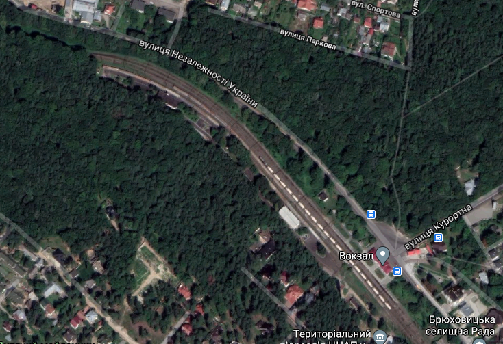 Фактично це є ліс, який знаходиться за залізничною станцією у Брюховичах. Поруч вокзал, готелі, кілька церков, садочок, Народний дім, ЦНАП – самісінький центр елітного селища. В оголошенні кадастрові номери ділянок не зазначені. Але вивчення кадастрової карти України підказало, що це можуть бути ділянки 4610166300:04:003:0069 та 4610166300:04:003:0119, площа яких в сумі складає майже 5 га.