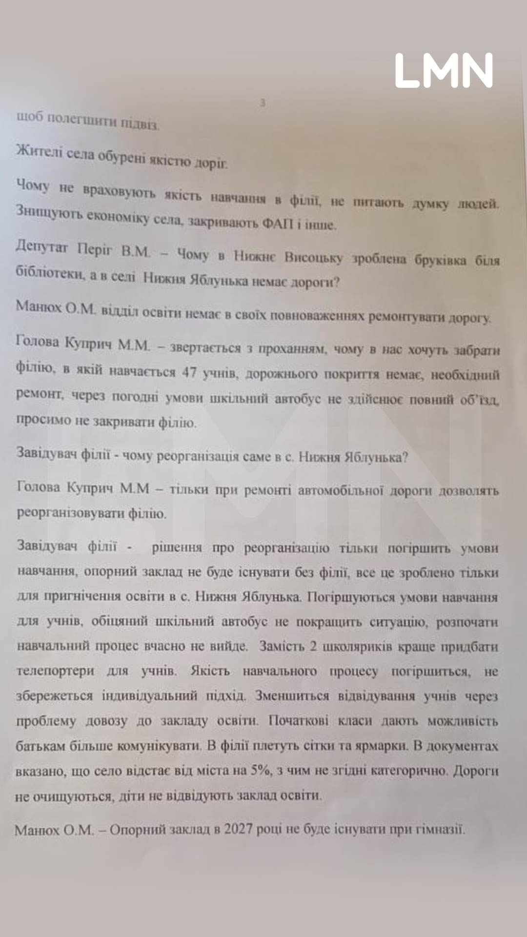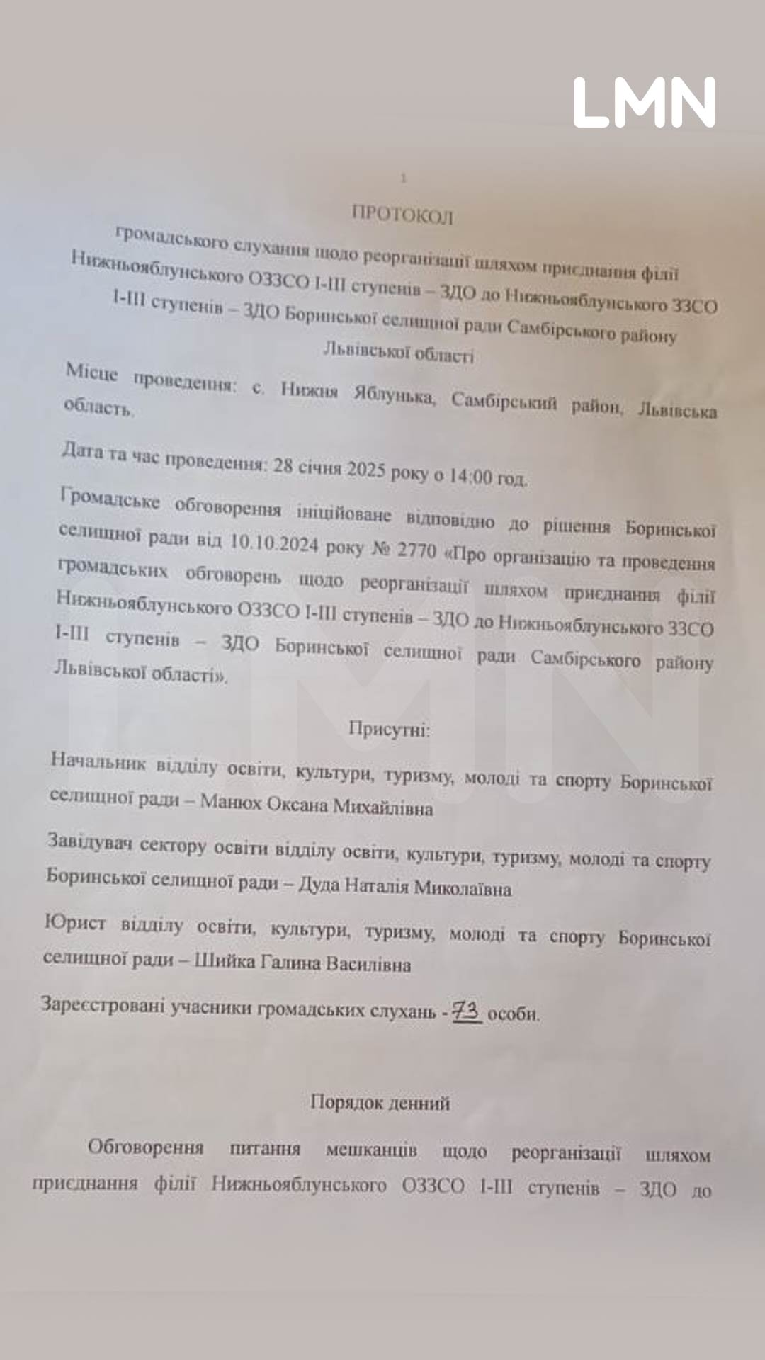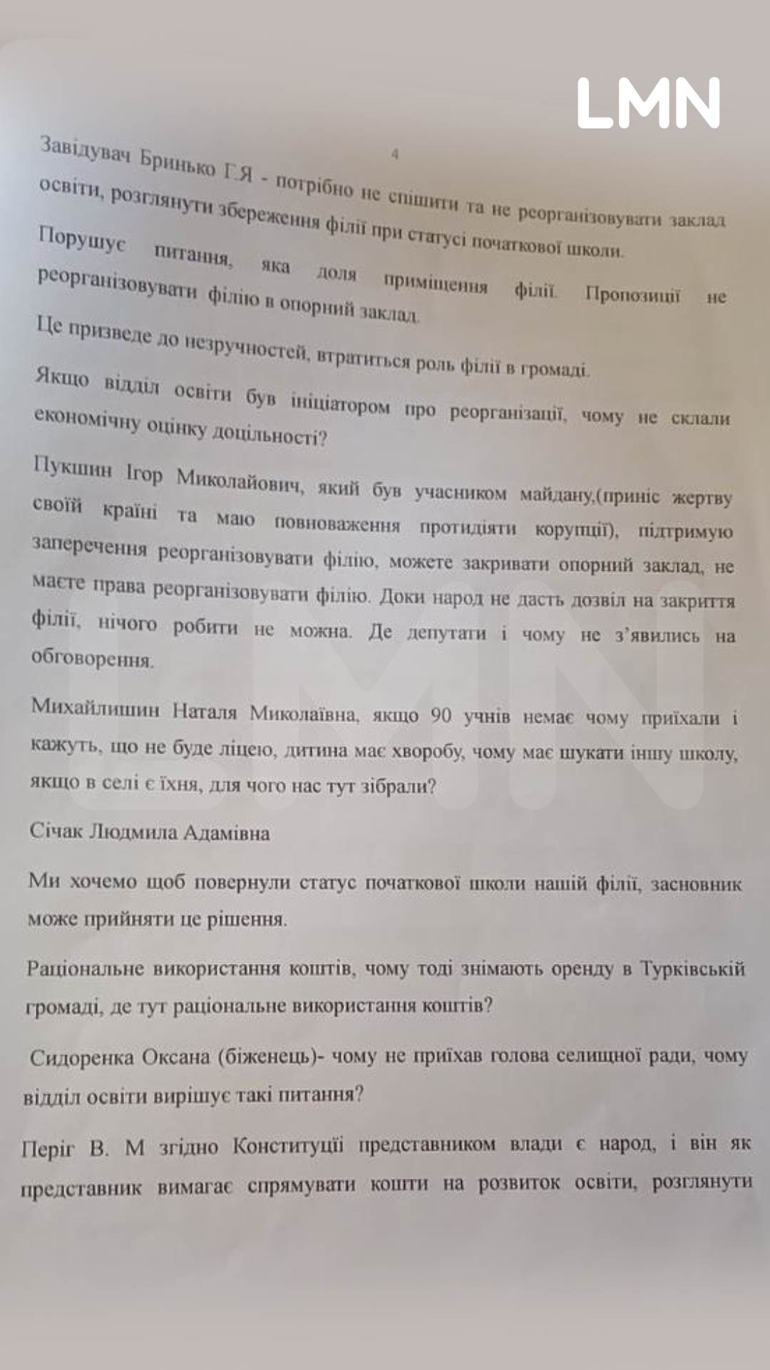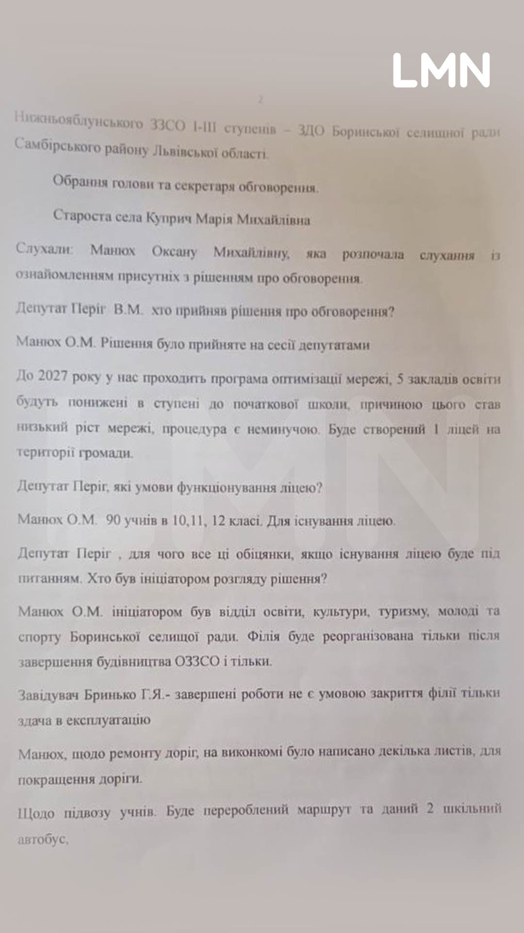 Під час слухань склали протокол і питання пообіцяли винести на сесію, однак мешканці висловили своє обурення тим, що на слухання не прийшли ні голова ОТГ, ні депутати села. Замість них присутньою була начальниця відділу освіти Боринської селищної ради Оксана Манюх, яка зазначила, що до 2027 року діятиме програма оптимізації шкільної мережі.