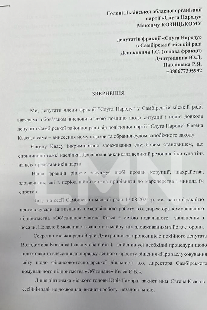 Депутати Самбірської міськради від партії «Слуга Народу» звернулися до очільника обласного осередку та начальника Львівської ОВА Максима Козицького з проханням ініціювати відкликання депутата Самбірської районної ради від «СН» Євгена Кваса. Йому, нагадаємо, як керівнику комунального підприємства «Об’єднане» нещодавно оголосили про підозру у зловживанні службовим становищем, яке спричинило тяжкі наслідки.