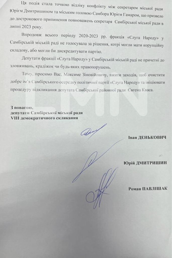 Звернення до нього підписали троє обранців Самбірської міськради від «СН» Іван Денькович, Юрій Дмитришин і Роман Павлішак.