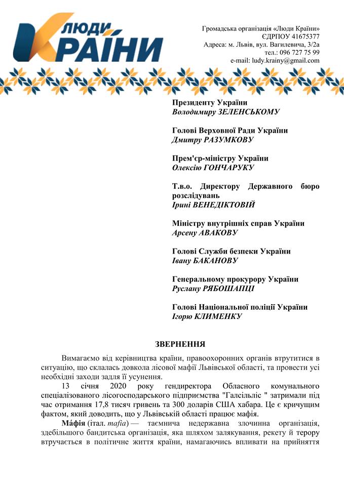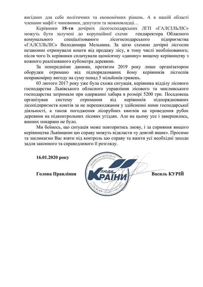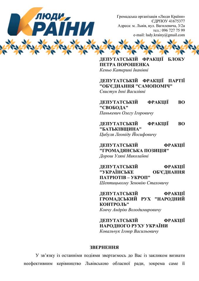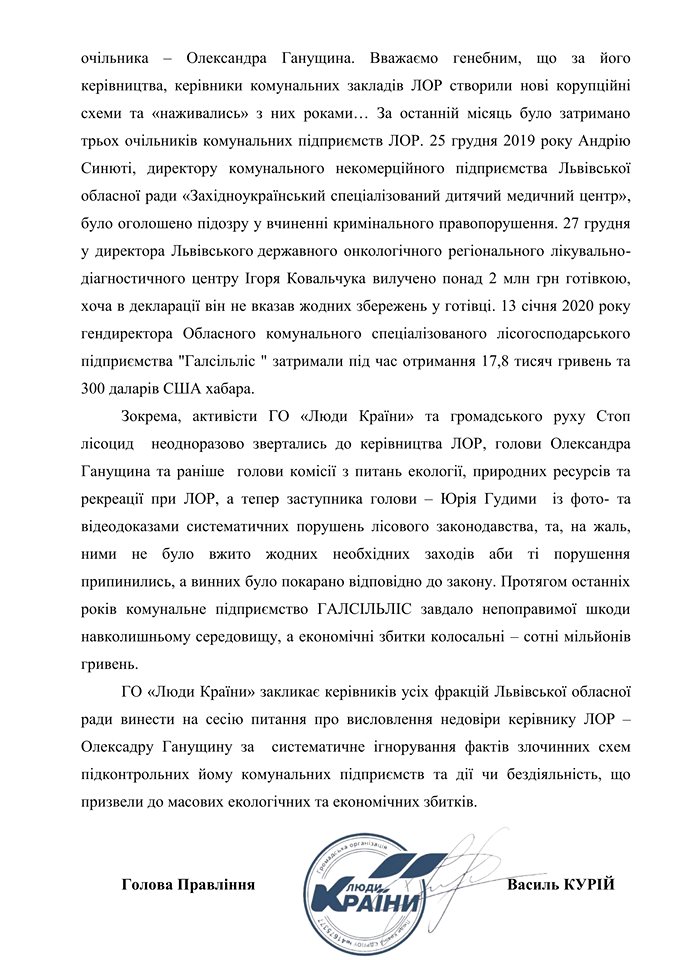 Сьогодні, 16 січня, активісти ГО «Люди країни» звернулися з офіційним листом до керівників фракцій у Львівській облраді. Просять винести на сесію питання про висловлення недовіри керівнику ЛОР Олександру Ганущину. Також звернулися до президента, прем’єр міністра, голови ВРУ України та керівників силових структур з проханням втрутитися у ситуацію, що склалася з комунальними підприємствами обласної ради.