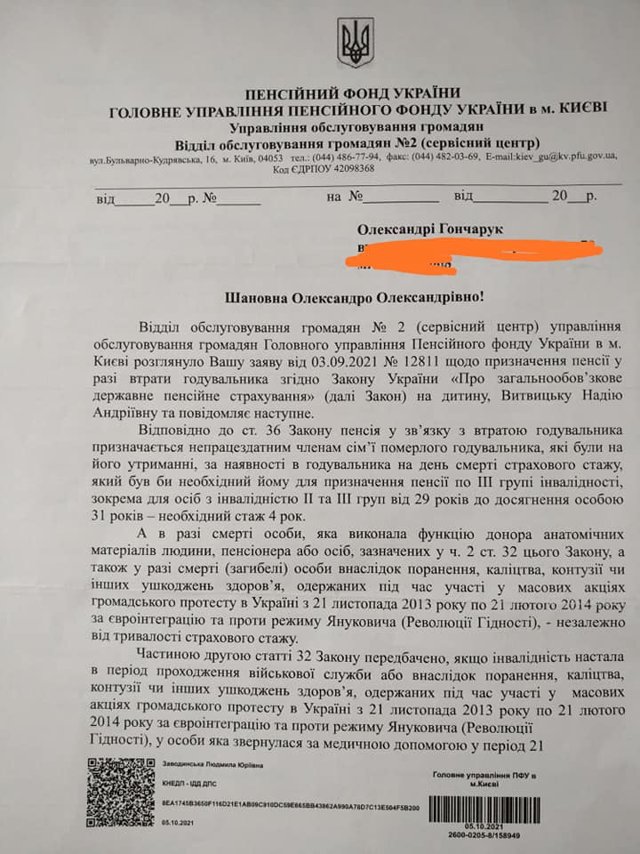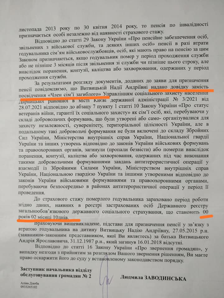 “Перше, що не влаштувало у документах – наявність довідки про статус члена сім’ї загиблого, а не посвідчення. Очевидно, у пенсійному фонді не відомо, що 6-літня дитина не може отримати посвідчення. Друге – відсутність стажу. Очевидно, у пенсійному фонді не розуміють, що доброволець воює 2014-2018 роках без заробітної плати і не може робити відрахування”, – коментує дружина загиблого Олександра Гончарук.
