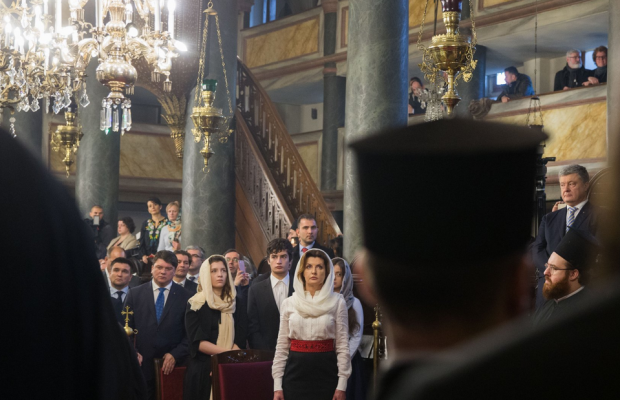 На службі була українська делегація у складі президента Петра Порошенко з дружиною, спікера Верховної Ради Андрія Парубія, очільників кількох міністерств та екс-президента Віктора Ющенка.