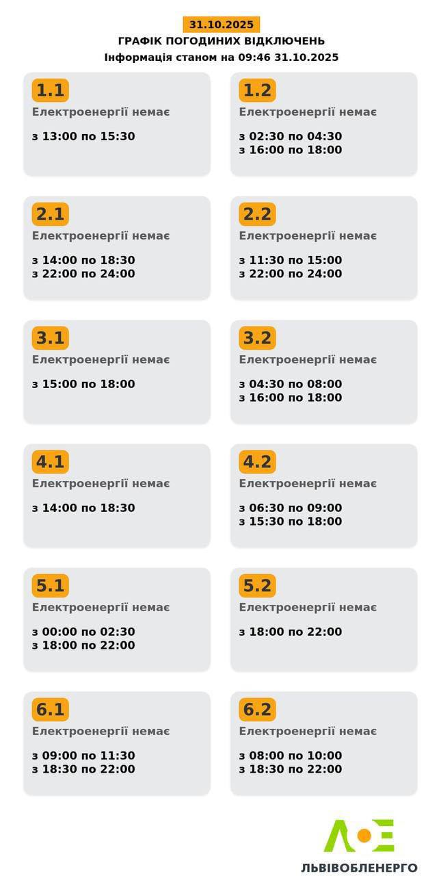 Упродовж пʼятниці, 31 жовтня, на Львівщині діятимуть графіки відключення електроенергії. Про це повідомили у «Львівобленерго».