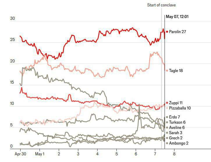 За даними платформ Polymarket, Kalshi та Betfair, на вибори Папи Римського вже поставили понад $19 мільйонів — це рекорд. Найвищі шанси наразі має держсекретар Ватикану П’єтро Паролін — коефіцієнт 1 до 4.
