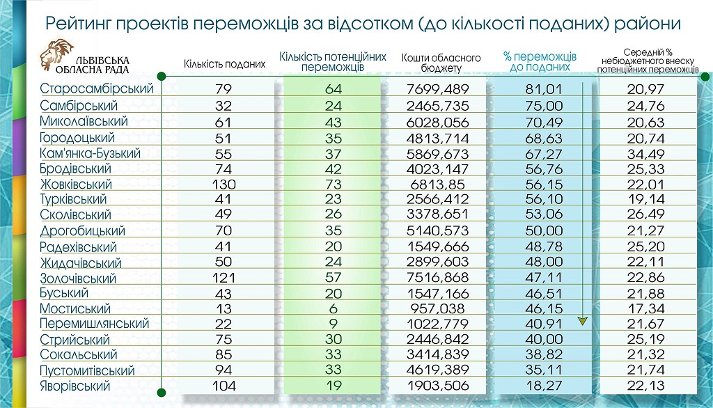 Лідером цьогорічного конкурсу став Старосамбірський район: із 79 поданих проектів потенційними переможцями стали 64 (81%).