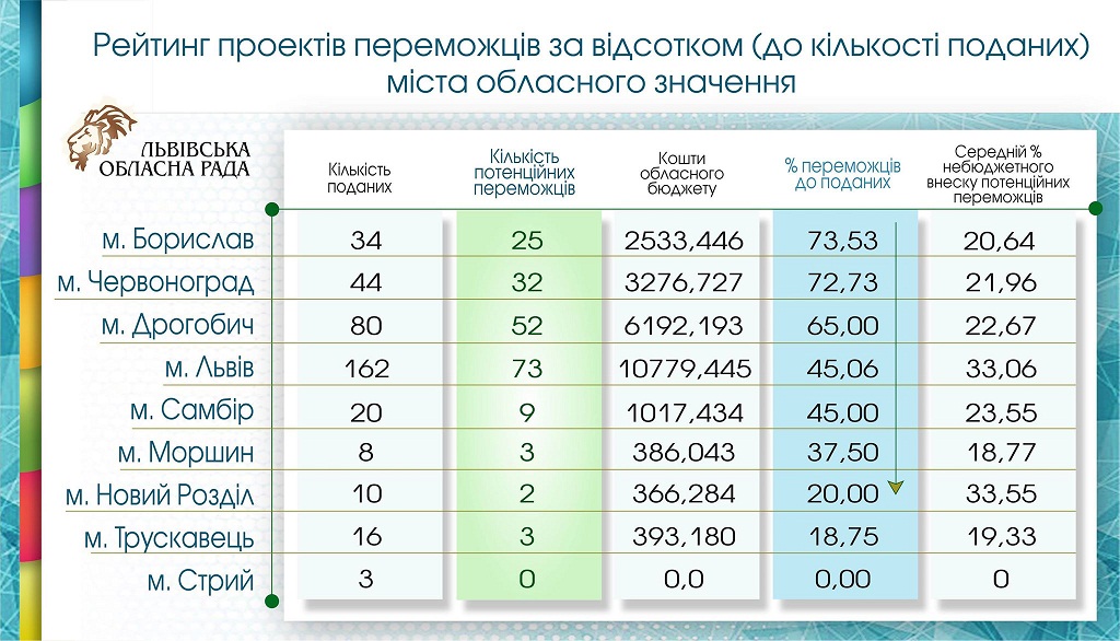 У розрізі міст обласного значення першість отримав Борислав, який подав 34 проекти, з яких перемогли – 25 (73,53%). Далі йдуть – Червоноград (32 з 44), Дрогобич (52 з 80), Львів з приміськими територіями (73 зі 162). А серед аутсайдерів, на жаль, як і минулого року, Стрий (0 з 3).