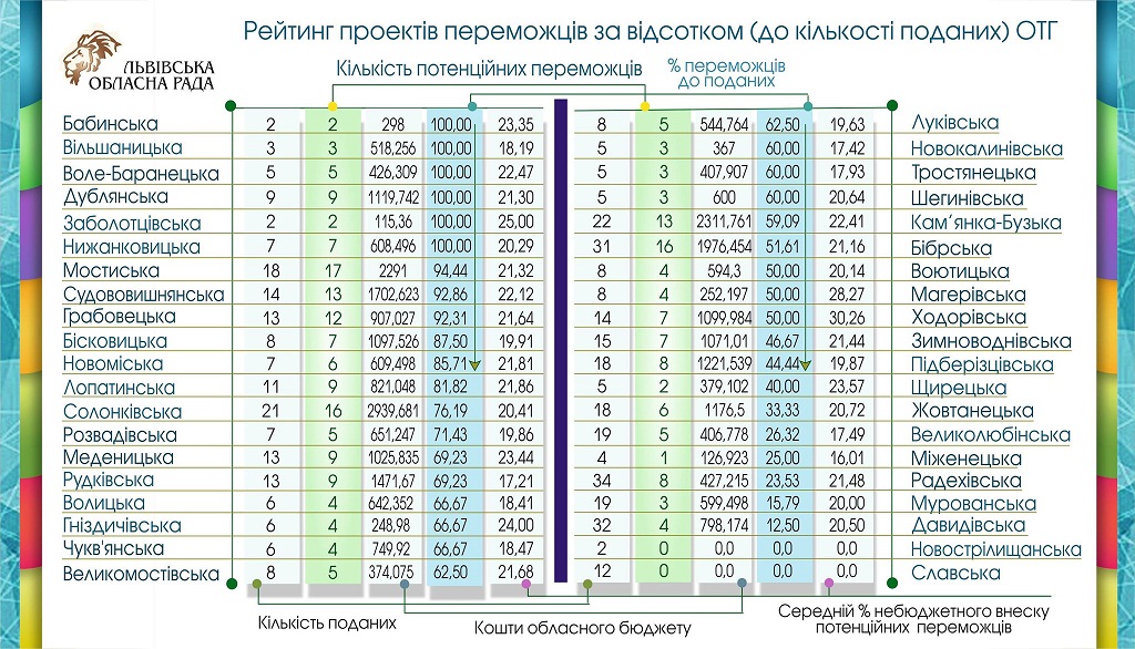 Далі в рейтингу за лідером ідуть – Самбірський: із 32 поданих проектів потенційними переможцями стали 24 (75%), Миколаївський: із 61 поданих проектів потенційними переможцями стали 43 (70,5%), Городоцький: із 51 поданих проектів потенційними переможцями стали 35 (68,6%), Кам’янка-Бузький: із 55 поданих проектів потенційними переможцями стали 37 (67,3%) райони.
