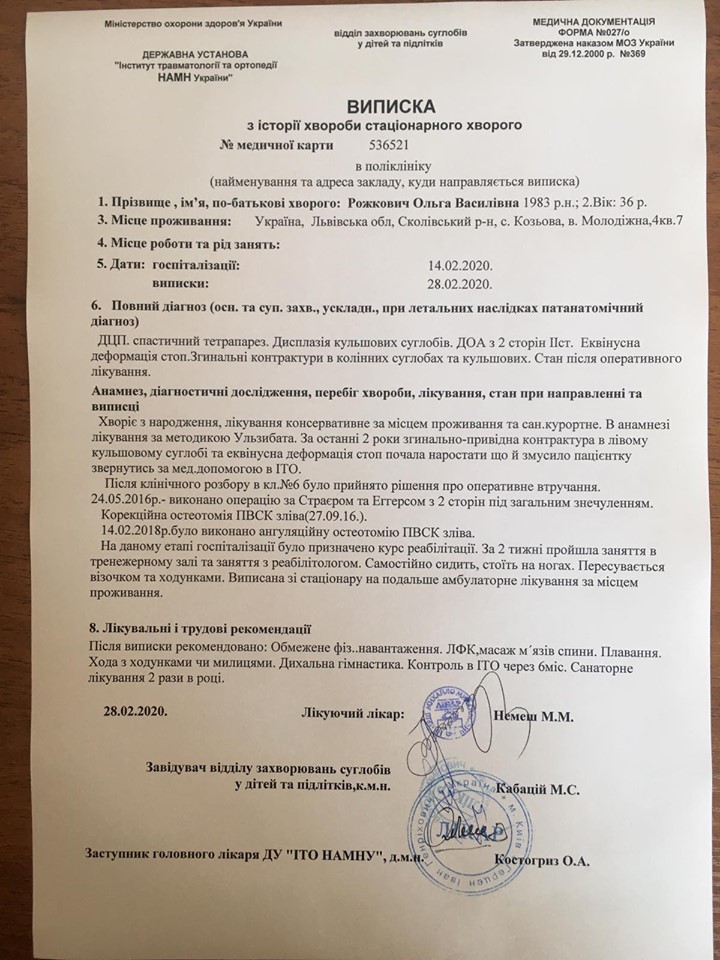 «Моя проблема почалася із раннього дитинства. Мама розповідала, що в 9 місяців мені зробили прививку. Вона дала ускладнення, після неї у мене розвинулось запалення в головному мозку. Лікарі ж взялися лікувати ДЦП. Препарати, які приписали від цього страшного захворювання, підняли мені спастику. Тіло викручувало, я терпіла страшні болі, а от полегшення не було ніякого. Коли мені виповнилось 10 років, до Львова приїздило подружжя лікарів із Америки. Взяли мене тоді на обстеження і виявили, що насправді ніякого ДЦП я не мала. Після запалення мозку залишився шов, його можна було вилікувати за допомогою правильно підібраних препаратів. А от, те чим мене лікували від ДЦП, просто зробили з мене інваліда на все життя», – розповідає Ольга.