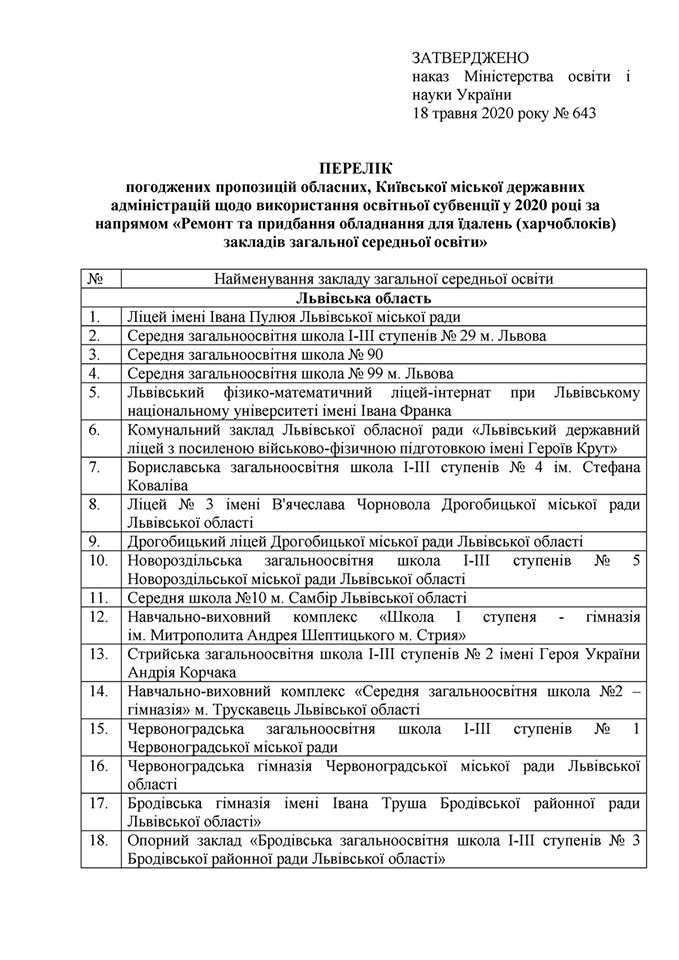 Сподіваємося, що до 1 вересня обладнання буде доставлене та встановлене в усіх 106 закладах Львівської області», – додає заступник голови ЛОДА Іван Собко.