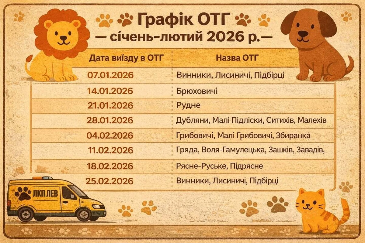 ЛКП «Лев» оприлюднило графік виїзду бригади ловців ЛКП «Лев» на території Львівської громади у січні та лютому 2026 року.