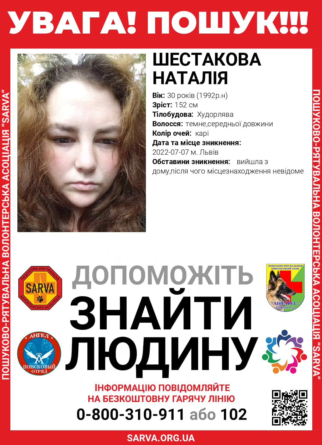 Усіх, кому відома будь-яка інформація про місцеперебування Наталії, просять повідомляти на безкоштовну гарячу лінію 0-800-310-911 або 102.