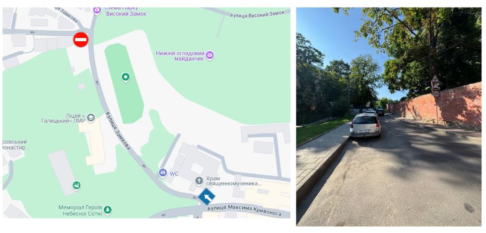 🔹 Вулиця Замкова — хоч має 6 метрів завширшки, одна смуга фактично завжди зайнята припаркованими авто. Тому фактично вона вже давно працює як одностороння, але юридичного статусу такого не мала. Відтепер це зміниться офіційно.
