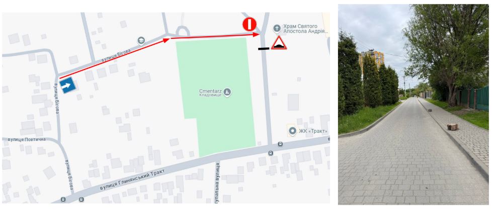🔹 Вулиця Бігова — стане односторонньою на прохання місцевих мешканців. Дорога там дуже вузька — лише 4 метри, що ускладнює роз’їзд автівок. Новий рух передбачає заїзд з вулиці Тракт Глинянський, а виїзд — у напрямку кладовища.
