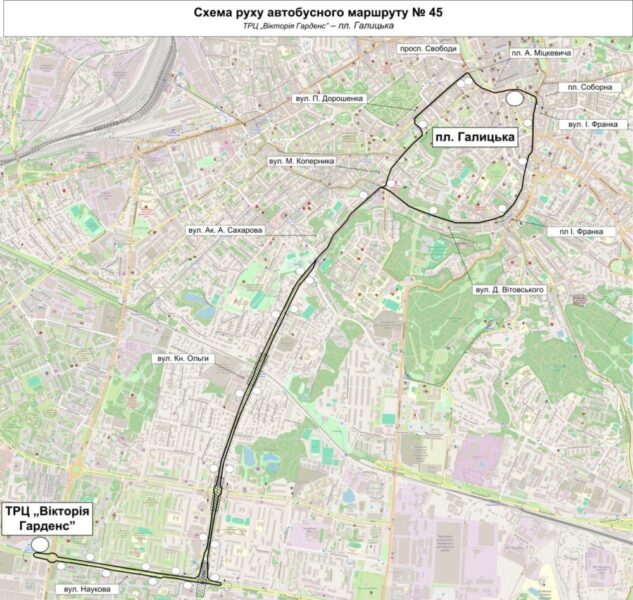 З наступного тижня у Львові запрацює автобусний маршрут №45, зі сполученням пл.Галицька – ТРЦ «Вікторія Ґарденс». Як повідомили у Львівській міській раді, на лінії курсуватимуть автобуси середньої вмістимості.