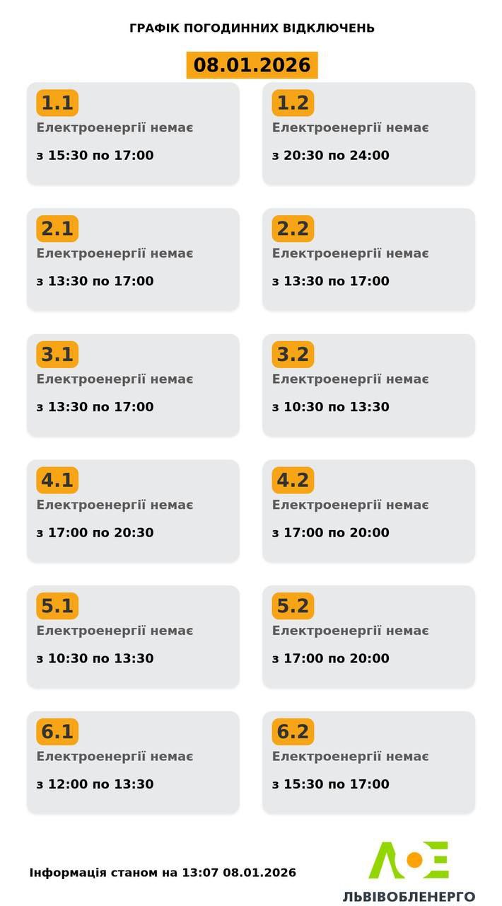 У Львові та області 8 січня вчергове оновили графіки відключень світла. Про це повідомили у «Львівобленерго».
