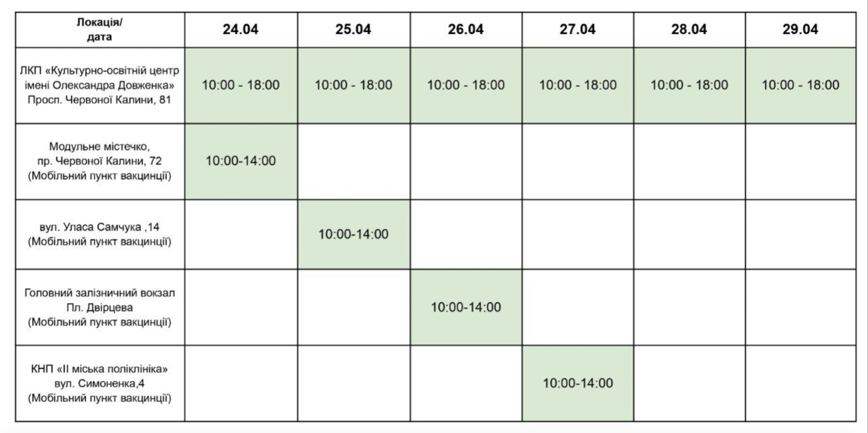 Зокрема, щоденно із 10:00 до 18:00 пункт вакцинації діятиме у Центрі Довженка, що на Сихові. Також у понеділок з 10:00 до 14:00 медики викцинуватимуть у модульному містечку на Сихові. У вівторок мобільний пункт вакцинації діятиме на вулиці Самчука. В середу – на Головному залізничному вокзалі, а в четвер – в поліклініці на вулиці Симоненка.