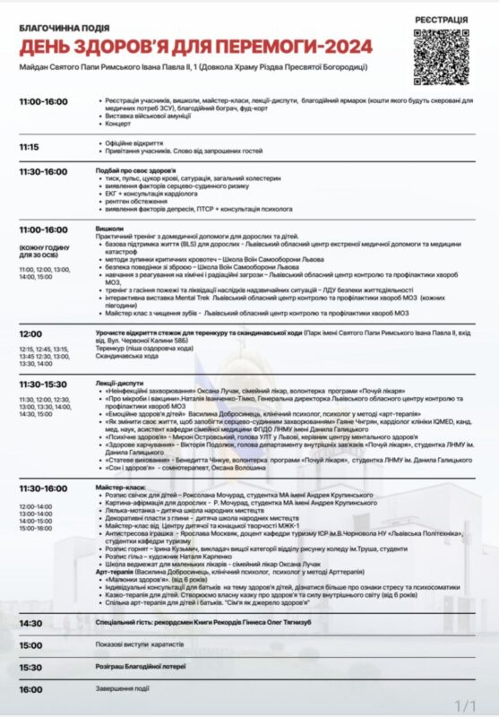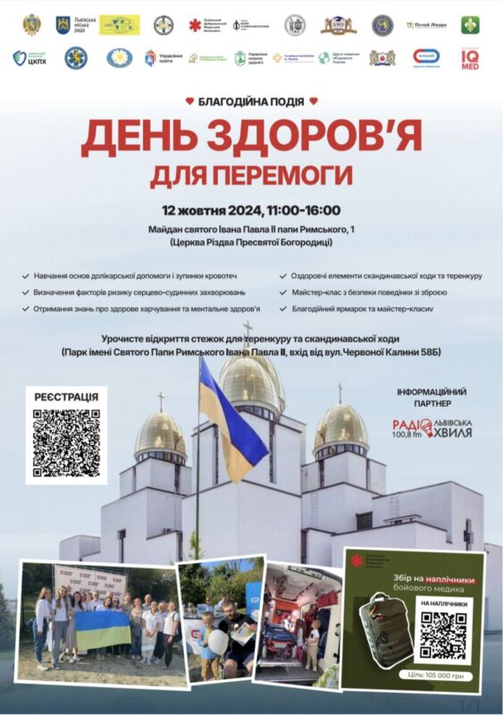“Заплановане відкриття стежок для теренкуру та скандинавської ходи в Парку імені Святого Папи Римського Івана Павла II (вхід від вул. Червоної Калини 58Б). Учасники благодійної акції зможуть визначити фактори ризику серцево-судинних захворювань, отримати консультації кардіолога, психолога, дізнатися інформацію про здорове харчування та ментальне здоров’я, освоїти основи долікарської допомоги, зупинки кровотеч, безпеки поведінки зі зброєю”,- йдеться в повідомленні.