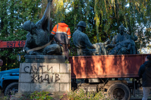 У Львові демонтували три радянські скульптурні композиції з «Пагорбу слави», а саме: «Мати-Батьківщина», «Воїн з прапором» та «Присяга». Про це повідомив перший заступник міського голови Львова Андрій Москаленко.