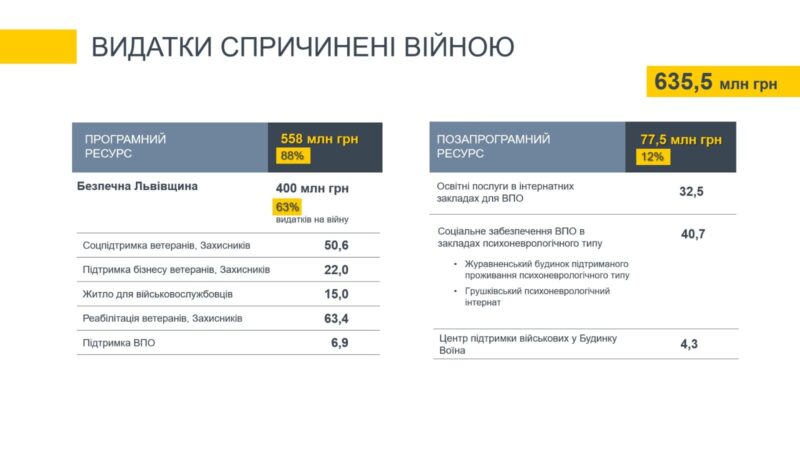 - Допомога в умовах війни – 9%. Цей пункт охоплює фінансування для ветеранів, переселенців, а також втілення ініціатив, спрямованих на безпеку.