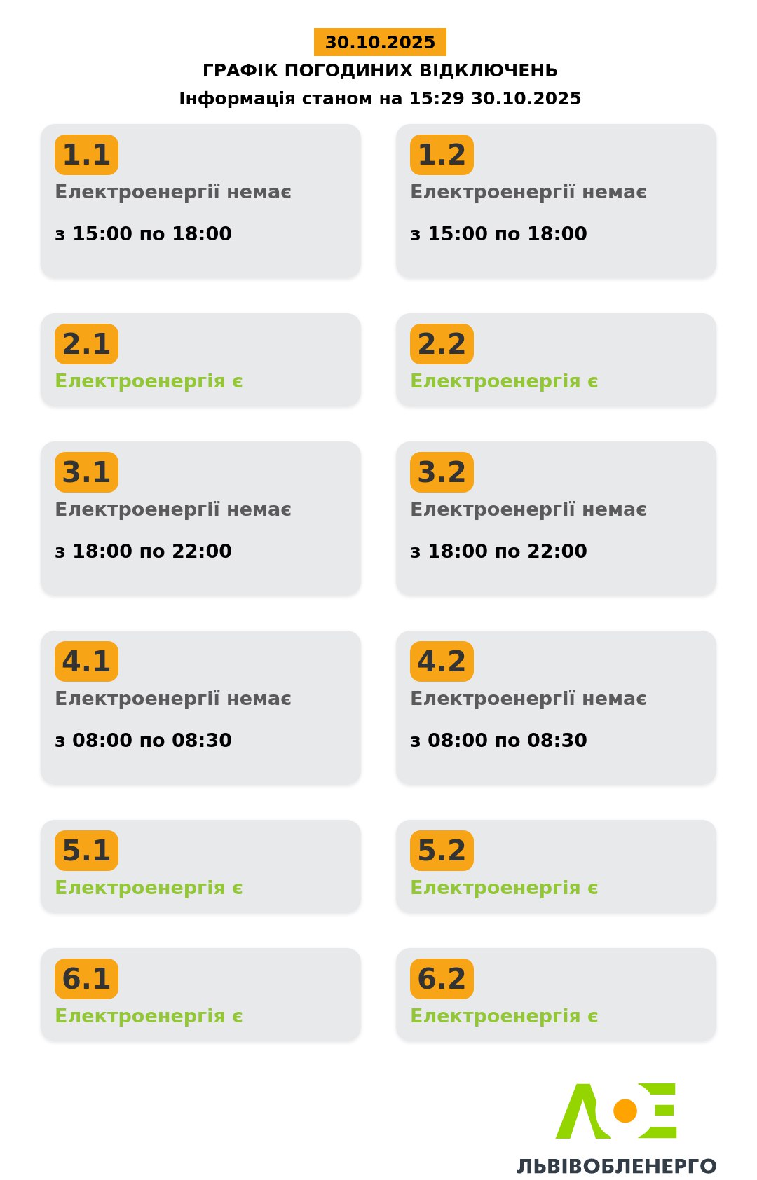 У Львові після нічної атаки росіян 30 жовтня станом на 15:30 запровадили графіки відключень світла. Про це повідомили у «Львівобленерго».