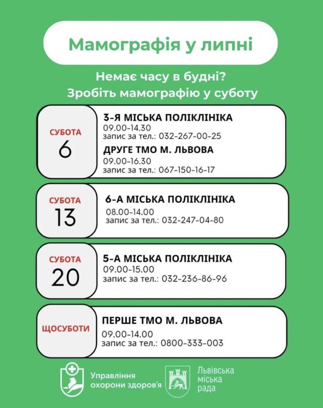 Як повідомили у Львівській міській раді, для зручності мешканок, зробити мамографію можна у вихідний день – суботу. Із собою потрібно мати електронне скерування від сімейного лікаря, та попередньо записатись за телефоном обраного медичного закладу.