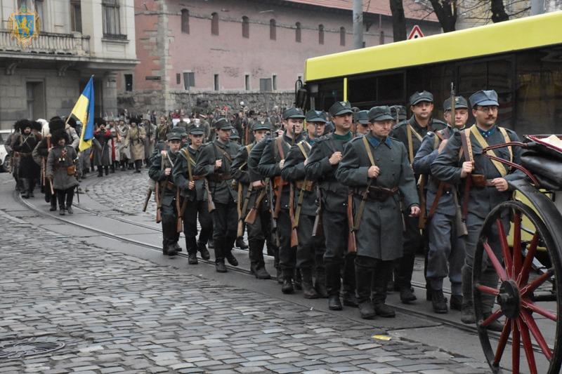 Марш відбувався під супровід оркестру Львівського Державного університету безпеки життєдільності. У ньому взяли участь більше, ніж сотня реконструкторів в одностроях УГА.