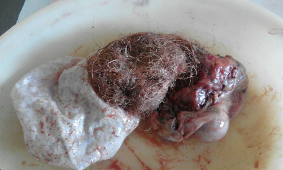 Додамо, дермоїдна кіста яєчника — це порожнина, покрита щільною оболонкою, в якій міститься жир, а також можуть бути волосся, нігті, зуби, кістки та інше. Науці відомий випадок, коли в такому новоутворенні були виявлені повністю сформовані очі. Кісти великих розмірів можуть викликати відчуття тяжкості в животі, запори, болі внизу живота, розлади сечовипускання.