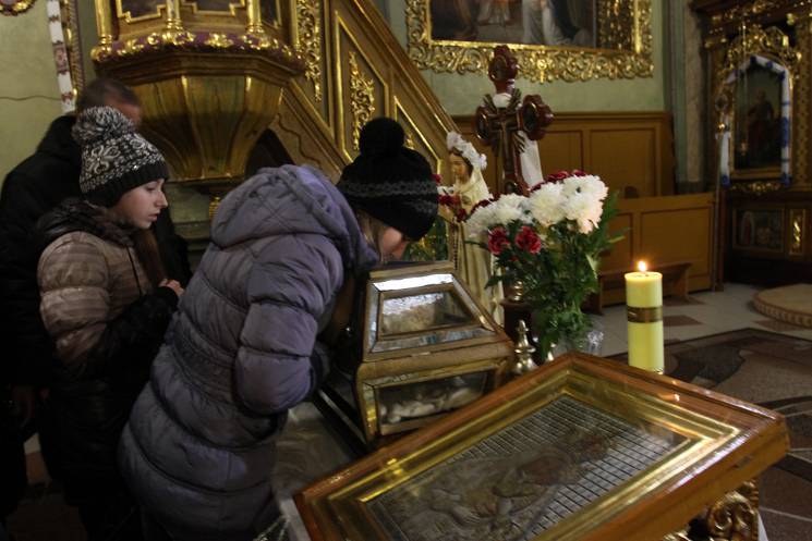 Усі охочі зможуть доторкнутися до реліквії та заступництва святого. У скляній труні — череп, декілька кісток і капсула з миром.