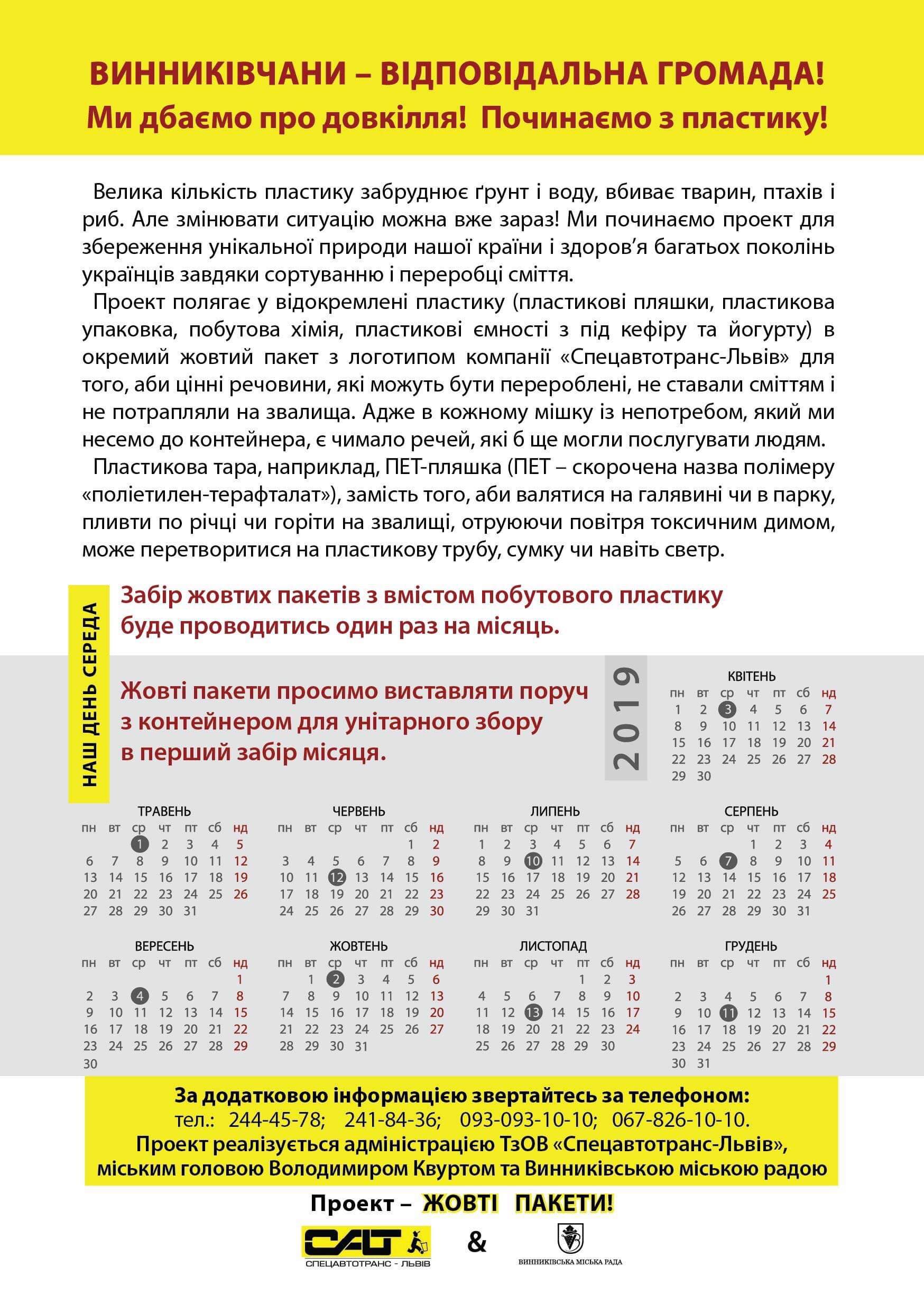 Із 1 квітня у Винниках розпочнуть експеримент, щоб привчити мешканців сортувати сміття. Проект “Жовті пакети” має на меті привчити жителів Винник роздільно викидати відходи, щоб потім віддати їх на переробку і не забруднювати довкілля. Окремо збиратимуть пластикове сміття, а з наступного року планують відсортовувати папір та скло.