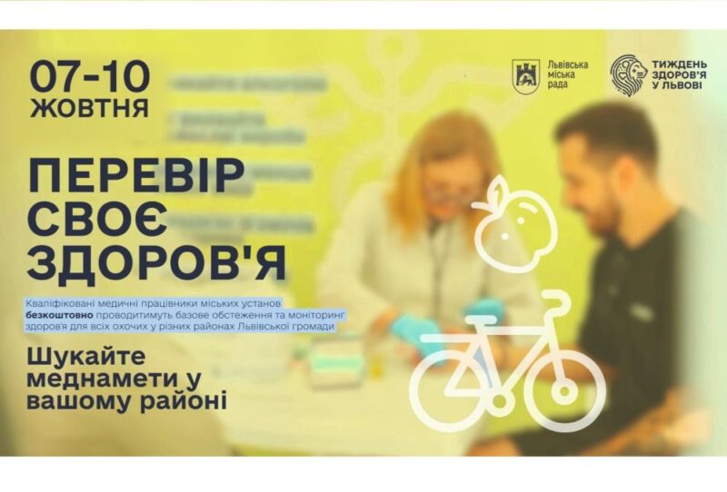 Восени мешканці Львівської громади знову матимуть нагоду безкоштовно перевірити своє здоров’я просто у своєму районі. З 7 до 10 жовтня у місті відбудеться черговий «Тиждень здоров’я». Медичні намети працюватимуть чотири дні поспіль на понад 20 локаціях Львова. Пройти обстеження зможе кожен охочий із 10:00 до 16:00 год. Про це повідомили у міській раді.