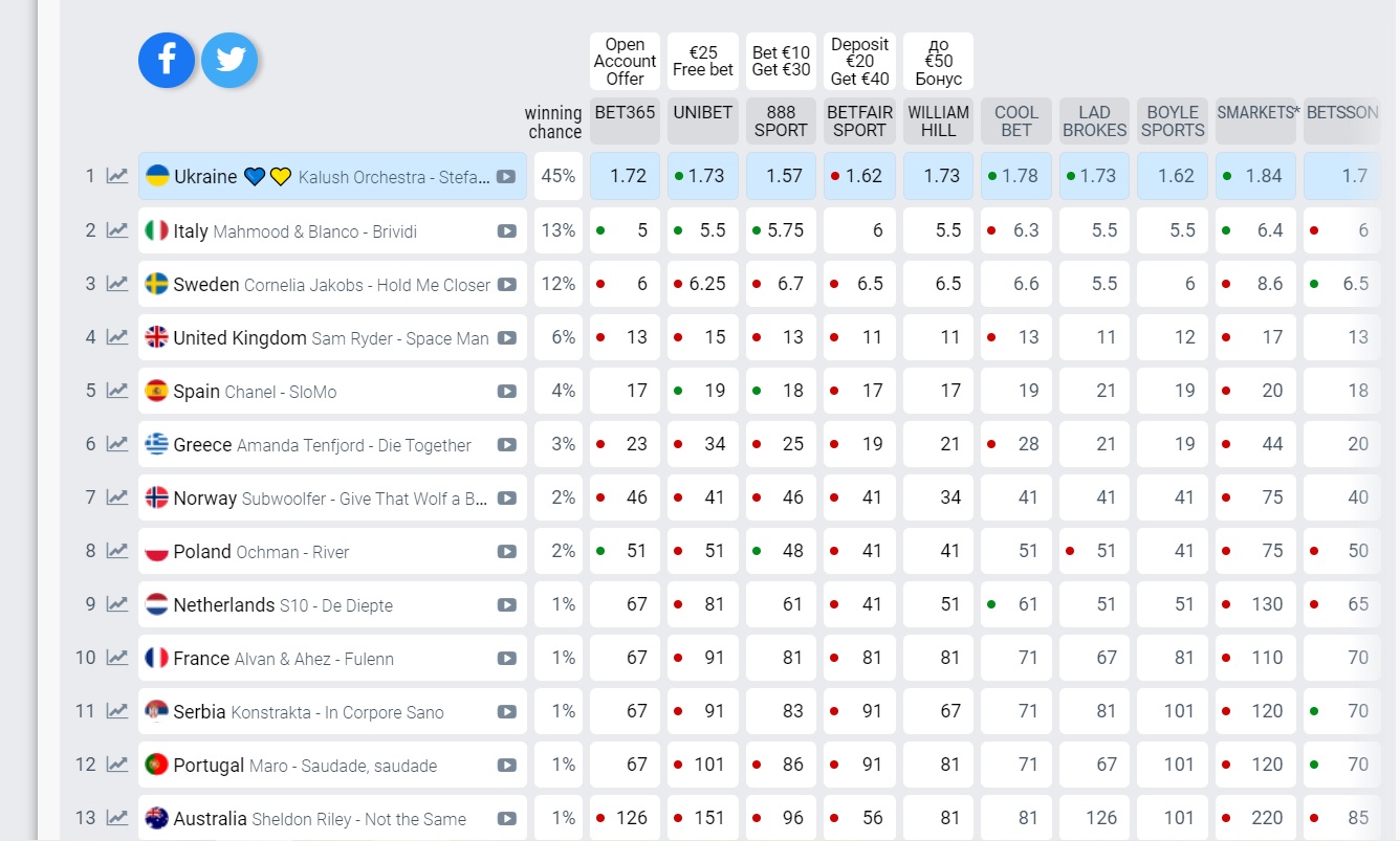 Далі йдуть представники Великої Британії (6%), Іспанії (4%), Греції (3%), Норвегії (2%) та Польщі (2%). Перемогу решти учасників оцінюють у 1% або менше.