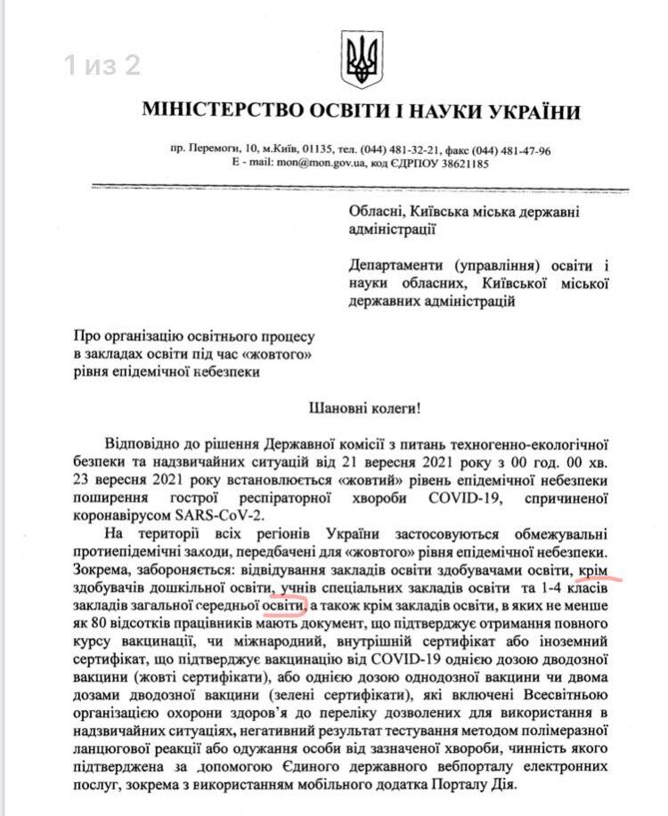 У «жовтій зоні» дозволено працювати в звичному режимі лише тим школам, де 80% персоналу вакциновані від коронавірусу. Решта мають перейти на віддалене навчання. Наразі у Львові та області лише 15% шкіл мають такий показник. До роботи також допускатимуть вчителів, які мають негативний ПЛР-тест, що діє 72 год, довідку про перенесений упродовж півроку коронавірус або довідку про протипокази до вакцинації. Однак школу можуть відправити на дистанційне навчання чи карантин, якщо більше 50% учнів перебувають на самоізоляції через контакт із хворими.
