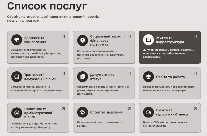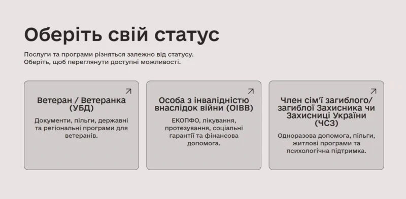 «Сервіс дозволяє користувачам обрати свій статус (ветеран, особа з інвалідністю внаслідок війни, член родини загиблого) і отримати персоналізований набір доступних послуг. Для кожного напряму підготовлені покрокові інструкції, що допомагають швидко зорієнтуватися в процедурах і звернутися до відповідних установ без зайвої бюрократії»,- йдеться в повідомленні.