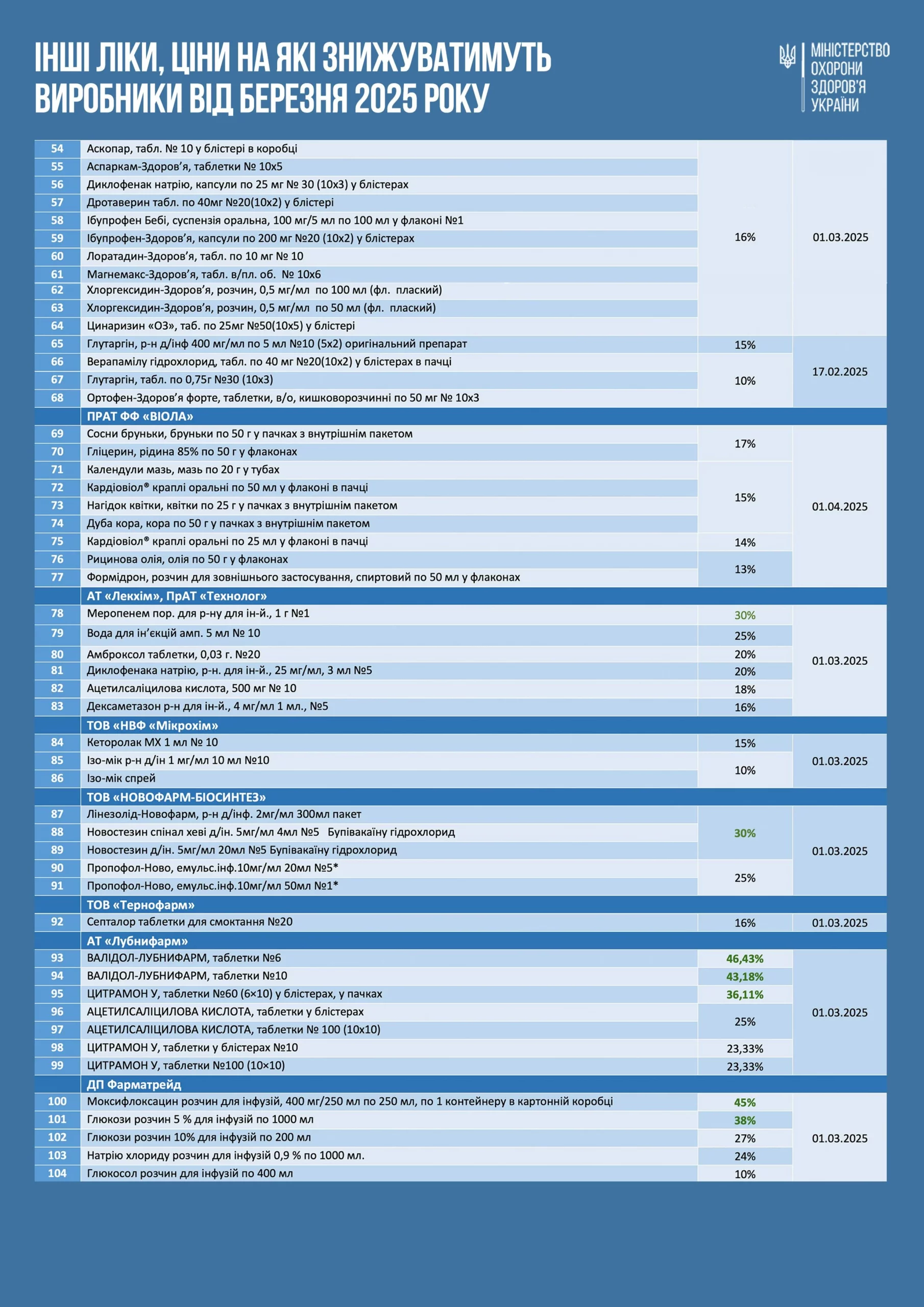 «Українські фармацевтичні виробники надали Міністерству охорони здоров’я України пропозиції щодо лікарських засобів власного виробництва, ціни на які вони готові знизити найближчим часом. Серед них, знеболювальні препарати, сорбенти, антациди, людські імуноглобуліни, антибіотики, анестетики, протиепілептичні лікарські засоби, протикашлеві, жарознижувальні, ліки, що застосовуються для регуляції артеріального тиску, вітаміни та мікроелементи», – йдеться в повідомленні.