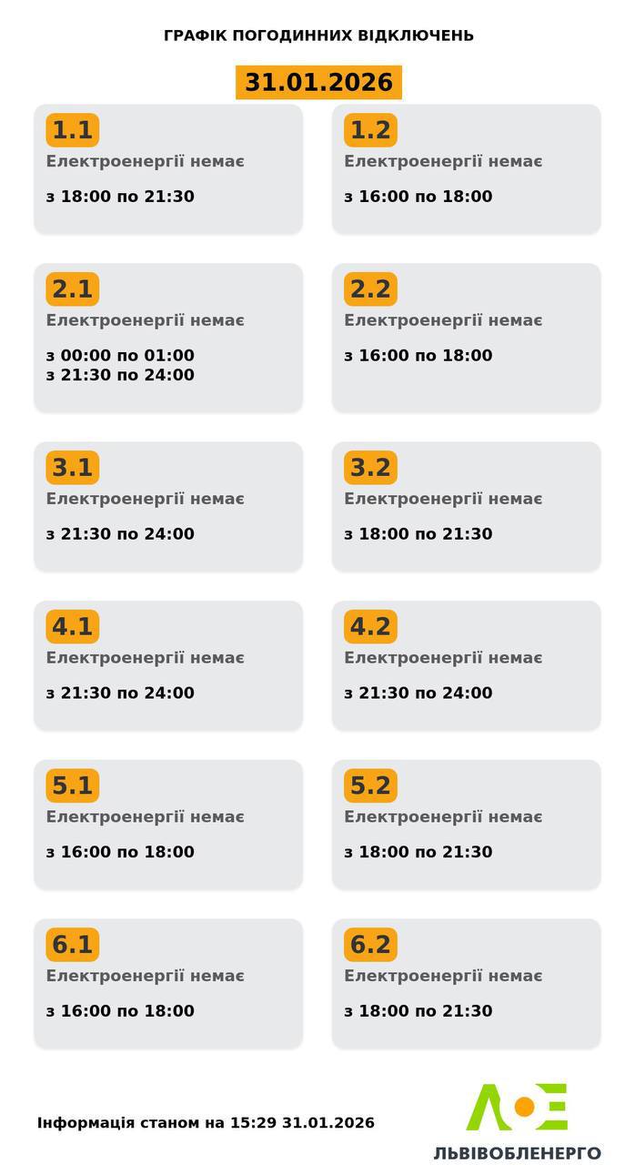 У суботу, 31 січня, на Львівщині діятимуть графіки відключення світла. Протягом дня графіки можуть змінитися.