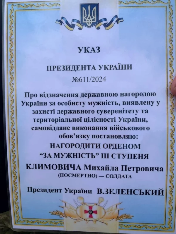 Відповідно до Указу Президента посмертно удостоїли державної нагороди Михайла Климовича. Як повідомили у Львівській ОВА, відзнаку вручили родині під час освячення надгробного памʼятника Воїна.