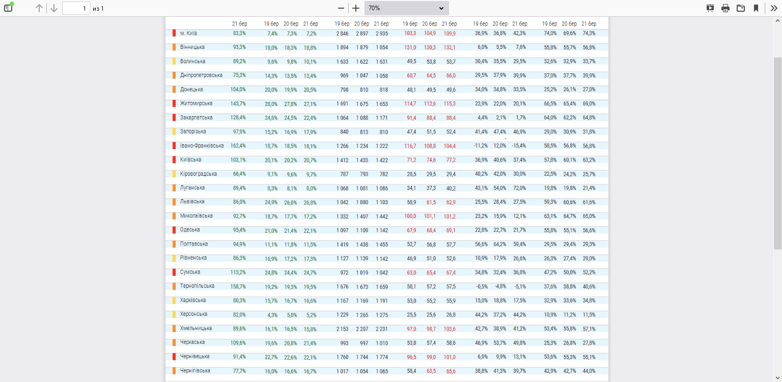 Найвищий показник завантаженості ліжок з киснем станом на 21 березня у Києві – 74,3%, Житормирській області – 69% (при визначеному показнику 65%).